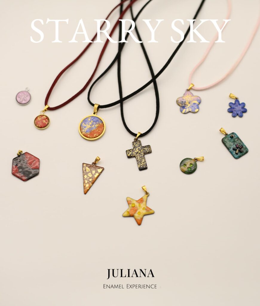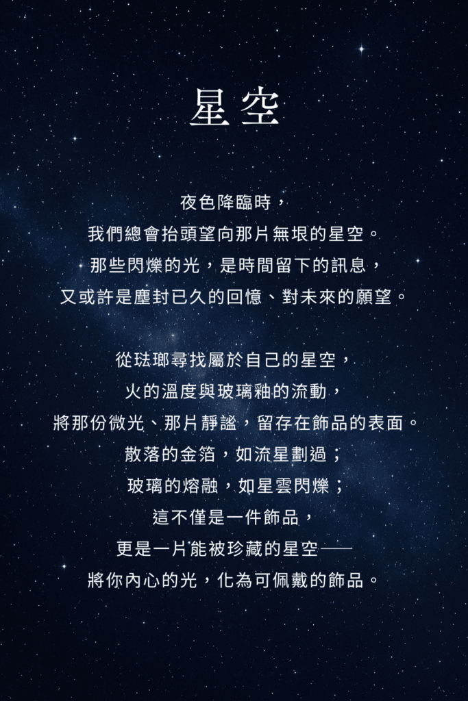 星空 琺瑯項鍊體驗課程 諮詢 報名 什麼是琺瑯? What is enamel? 琺瑯,又稱「七寶燒」,是一門結合金屬與玻璃,經由高溫燒製而成的古老工藝。其歷史可追溯至西元前 2300 年的美索不達米亞文明;在古埃及時期,琺瑯被廣泛應用於王室飾品、權杖與法老的金面具之中。隨後傳入希臘、羅馬與拜占庭帝國,成為宗教聖物與皇室珠寶的象徵。在炙熱的火焰中,琺瑯化為如寶石般的光澤,展現出透明而深邃的色彩。歷經千年傳承,至今仍以獨特的色彩層次與細膩質感,成為高級工藝的象徵。 星空故事 Creative Concept 體驗課程介紹 Experience Introduction 本課程將帶領您體驗傳承千年的琺瑯工藝之美。您可依照個人喜好,選擇喜愛的色彩與飾材(金箔/玻璃),在創作過程中,感受火焰、金屬與色彩交融的溫度,琺瑯將在燒製的瞬間幻化出如夜空般的光影層次,最終,親手完成一件屬於自己的琺瑯藝術飾品。 高級琺瑯材料細膩光澤,歷久彌新 使用日本原裝琺瑯釉藥,搭配台灣製金箔與日本琉璃裝飾,作品色澤飽滿、層次細膩,展現高雅而獨特的質感。 日本專業電窯穩定、安全、精準控溫 採用日本製專業電窯設備,操作簡易且安全性高,能精準掌握每一次燒製溫度。 體驗流程 Experience Steps 選擇樣式與釉色 提供超過 20 種胎底樣式,及18 色琺瑯釉。 紅銅胎底處理 使用砂紙將紅銅表面拋磨處理 琺瑯填色與裝飾 在老師指導下進行琺瑯釉填色,並學習金箔與琉璃珠的裝飾應用。 電窯燒製 此步驟為高溫操作,可選擇由老師陪同操作,或由老師代為完成。 項鍊組裝 選擇喜愛的線材顏色,由老師協助組裝成完整的琺瑯吊墜項鍊。 報名體驗 Registration Experience ⊱ 若您選擇報名開課前三天的課程,報名後請主動聯繫我們以加速處理流程。⊱ 填寫報名表後JULIANA將在24小時內傳送付款資訊及確認信,請於收到確認信後3日內完成付款。 星空琺瑯體驗體驗場次如欲報名一個場次以上,請分開報名雲林教室 2025/11/29(六) 上午10:00-12:00 2025/11/29(六) 下午1:00-3:00 ʚ親子限定場次ɞ 2025/11/29(六) 下午3:30-5:30 2025/11/30(日) 上午10:00-12:00 ʚ親子限定場次ɞ 2025/11/30(日) 下午1:00-3:00 2025/11/30(日) 下午3:30-5:30報名資料姓名行動電話電子信箱體驗人數- 請選擇報名人數 -1人2人3人4人5人6人從哪裡看到我們的課程呢?- 選擇 -官方網站google/搜尋引擎FacebookInstagram親友介紹其他體驗目的- 請選擇體驗目的 -興趣體驗親子娛樂慶祝生日慶祝紀念日慶祝佳節其他課程年齡限制 皆年滿18歲以上 13~17歲經家長同意報名,燒窯過程由老師代燒 12歲以下有家長陪同 ʚ請選擇親子時段ɞ其他備註事項 我已閱讀並同意教室規範、交易政策以及隱私權政策。報名完成